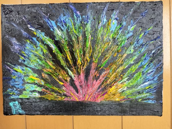 ついペタペタを筆でぬってしまって、花火らしくなくなって困ったり、ペインティングナイフは持ち方から悩んでしまいましたが、この仕上りは大満足?!
