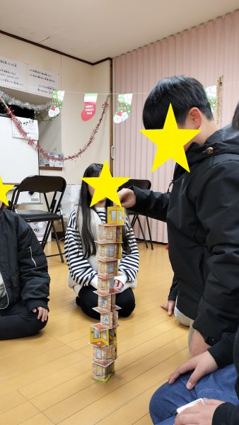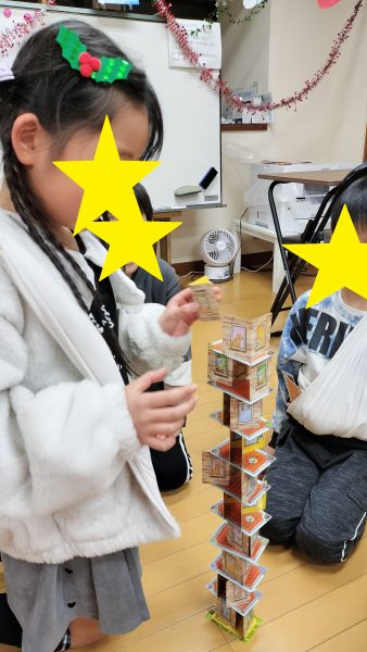 高いタワーを積んでいくのですが、みんなドキドキしながら頑張りました(^^