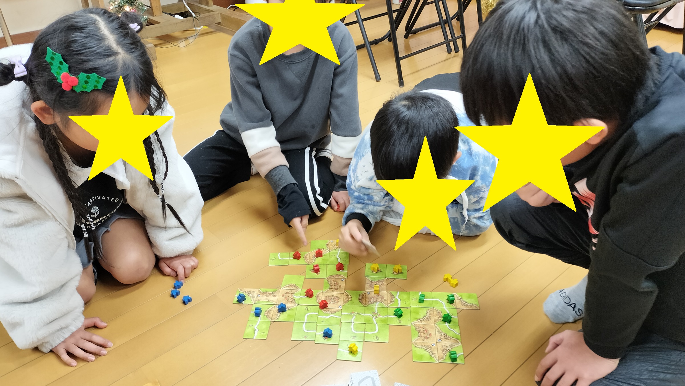 タイルを使って陣地を広げていくゲームで、お城ができるかな?道を続けよう!など、ワクワクしながら進めました。