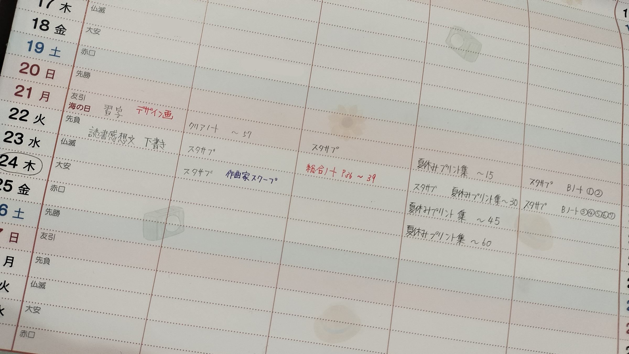 中学生クラスは夏休み宿題予定表を作りませんが、各自でカレンダーに書きこんで、残りを確認しつつ頑張って欲しいと思います。